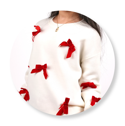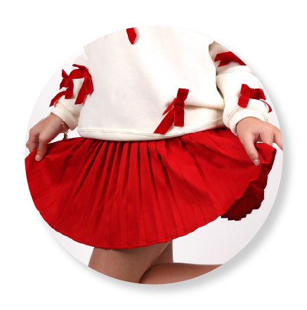 A cute bow-pattern sweater and a red pleated skirt make the perfect holiday combo for kids. It’s sweet, simple, and photo-ready!