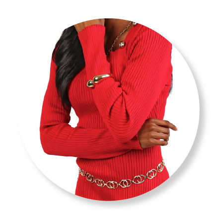 If sophisticated is your mantra, this red knit dress gives you a soft, flattering fit with a touch of gold-chain detail for extra shine. Paired with black boots, it’s an easy option for when you want to look a little extra without going overboard.