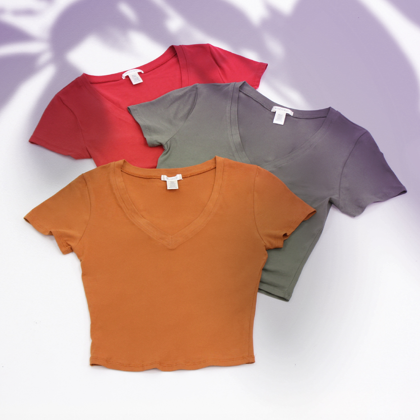 The ultimate everyday tee lineup, terracotta, sage, and muted red V-necks that go with everything.