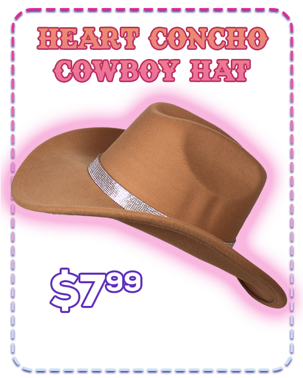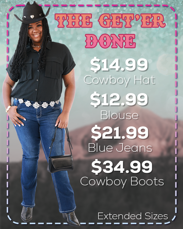 This outfit will have you walking tall, feeling like the alluring stranger that just rode into town that people just can't keep their eyes off. Pair this two pocket camp blouse with our exclusive Frenzy brand jeans, distressed black boots and of course our heart Concho cowboy hat for that sweet look. This outfit mixes a little rustic charm with some sweet soft details to give you a look that is powerful and adorable at the same time.