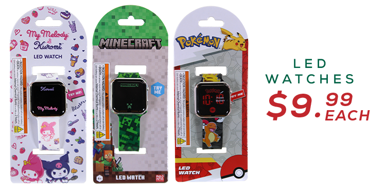 If you have someone on your list that could rather count moments than capture them, perhaps you should consider a watch as a gift… We have a selection on licensed LED watches that are easy to read, come on comfortable rubber straps and feature kid favorite characters. The case shape mimics an apple watch, giving your young one a sophisticated look too. Whether you have a Hello Kitty enthusiast, a Minecraft Addict or someone who dreams of catching every Pokémon, we have an option for you. Best of all, these watches are just $9.99 each!
