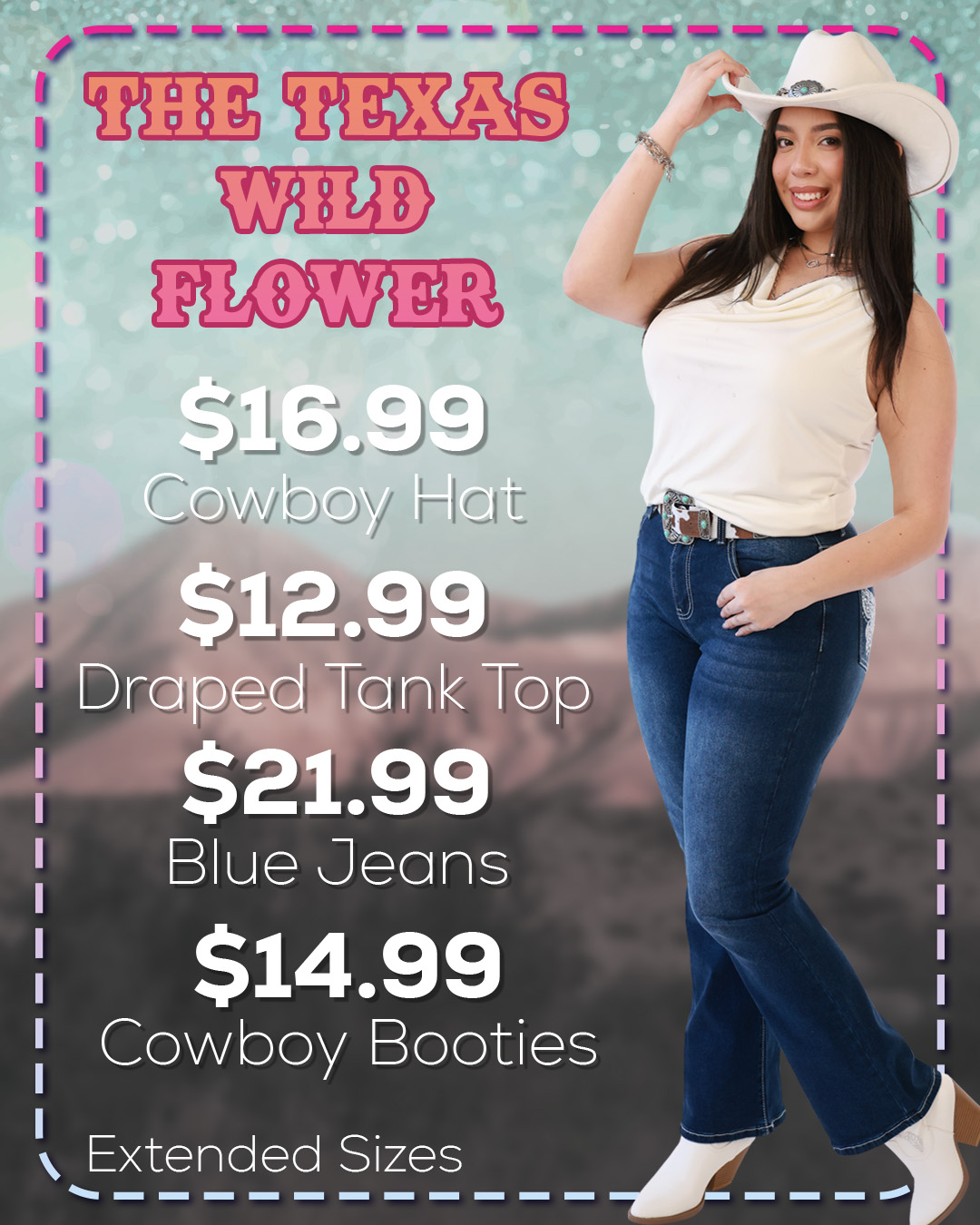 Dainty and wild is how they make'em out here! Be the Belle of the ball with our white drape neck layered tank top paired with our embroidered cowboy booties and embellished blue butterfly jeans. Finish this look off with a cow print western, and our Concho cowboy hat both decorated with turquoise stones to match the skies and antique silver tone metal.